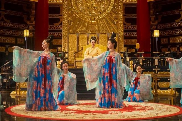 中秋夜游天堂名堂,大殿載歌載舞,仿佛回到千年前大唐盛世。中秋之日,一群盛裝歌姬白天登闕樓一睹恢弘盛世,傍晚在河邊放逐水燈許愿、思念家鄉(xiāng),夜晚在華麗的舞臺歌舞升平。一派大國盛世、國泰民安的場景。